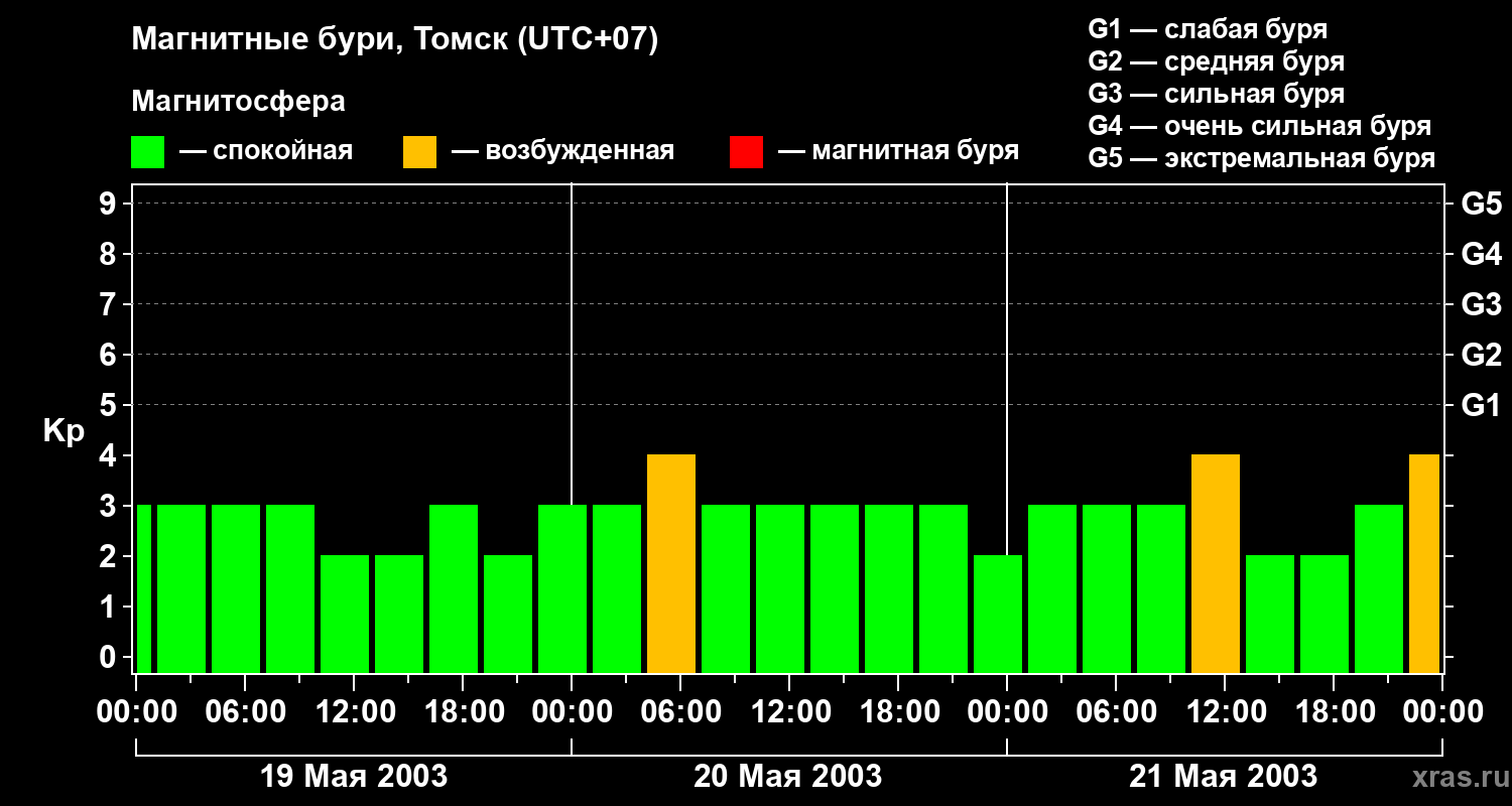 Изменения геомагнитного индекса Kp с 19 по 21 мая 2003 года для средних широт