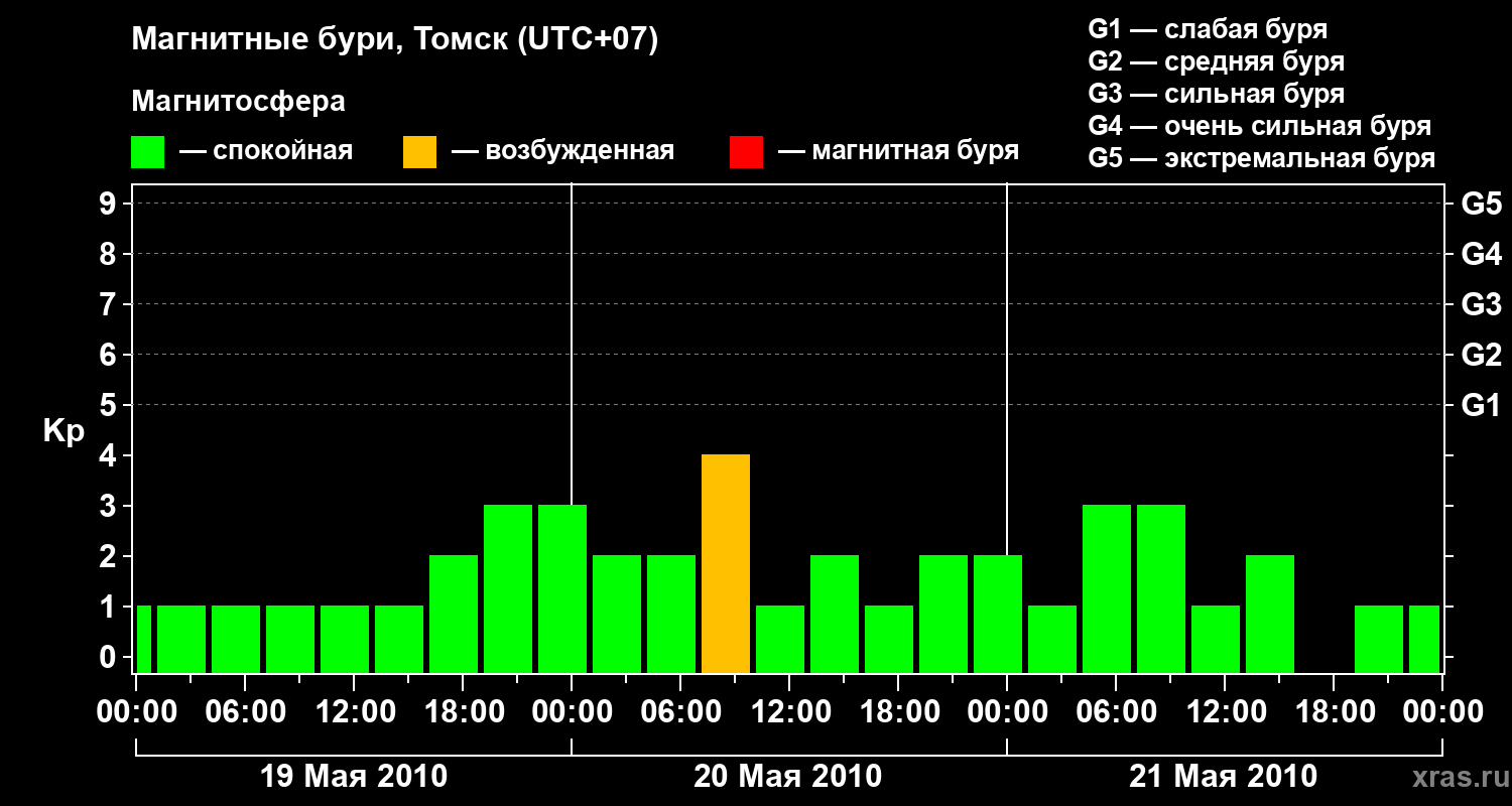 Изменения геомагнитного индекса Kp с 19 по 21 мая 2010 года для средних широт