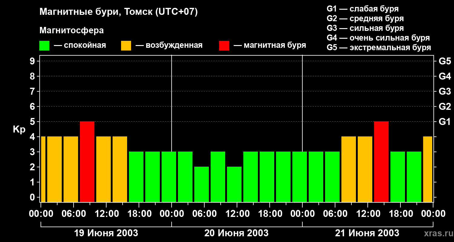 Изменения геомагнитного индекса Kp с 19 по 21 июня 2003 года для средних широт