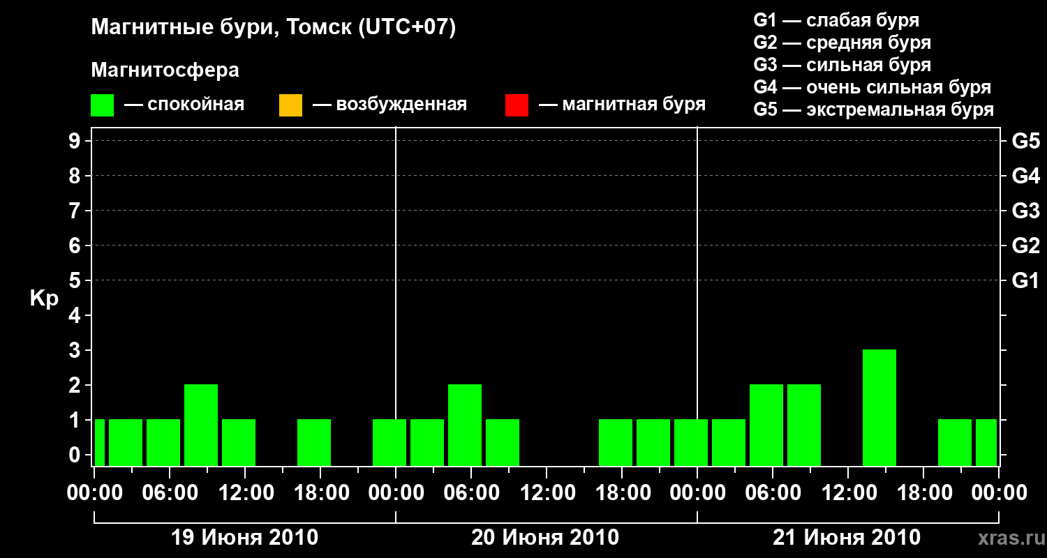 Изменения геомагнитного индекса Kp с 19 по 21 июня 2010 года для средних широт