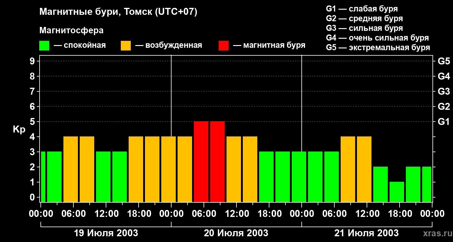 Изменения геомагнитного индекса Kp с 19 по 21 июля 2003 года для средних широт