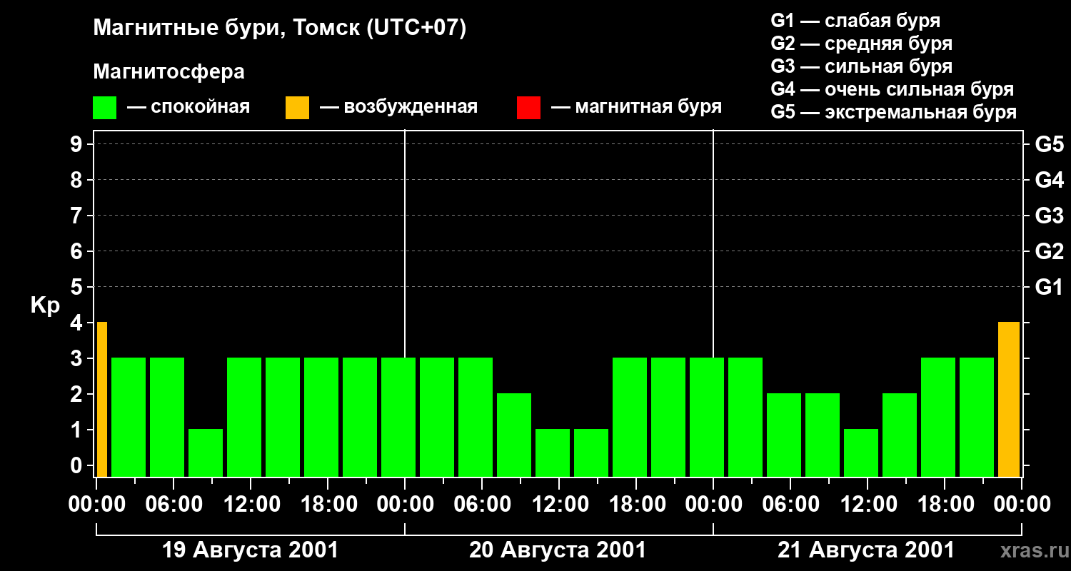 Изменения геомагнитного индекса Kp с 19 по 21 августа 2001 года для средних широт