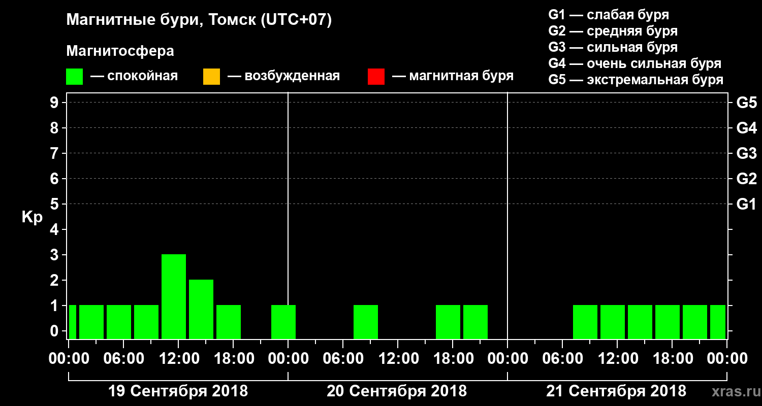 Изменения геомагнитного индекса Kp с 19 по 21 сентября 2018 года для средних широт