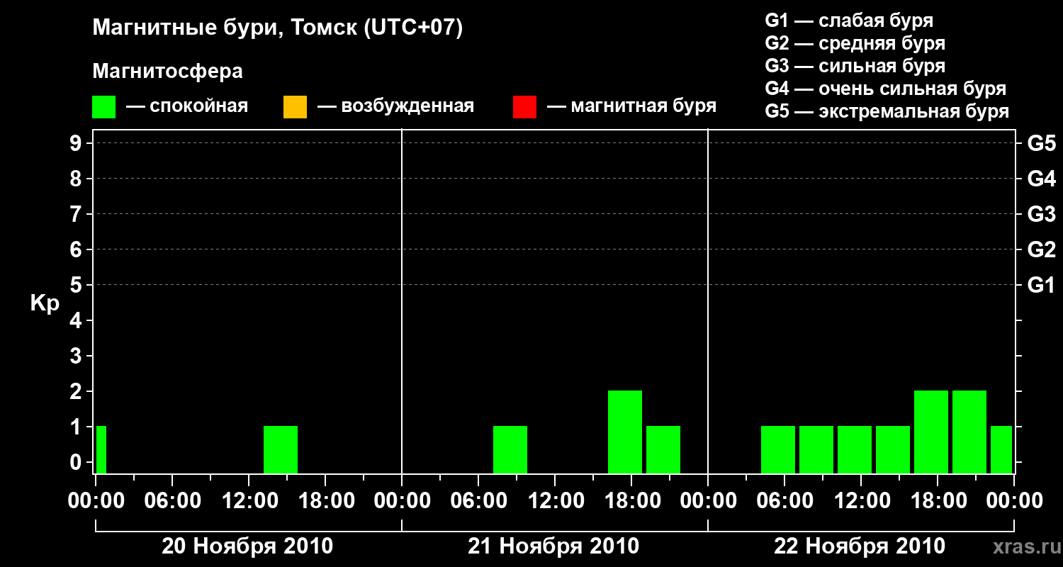 Изменения геомагнитного индекса Kp с 20 по 22 ноября 2010 года для средних широт