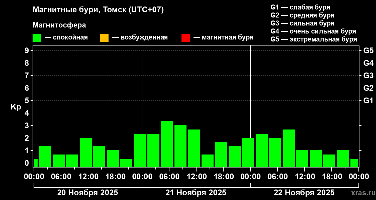 Изменения геомагнитного индекса Kp с 20 по 22 ноября 2025 года для средних широт