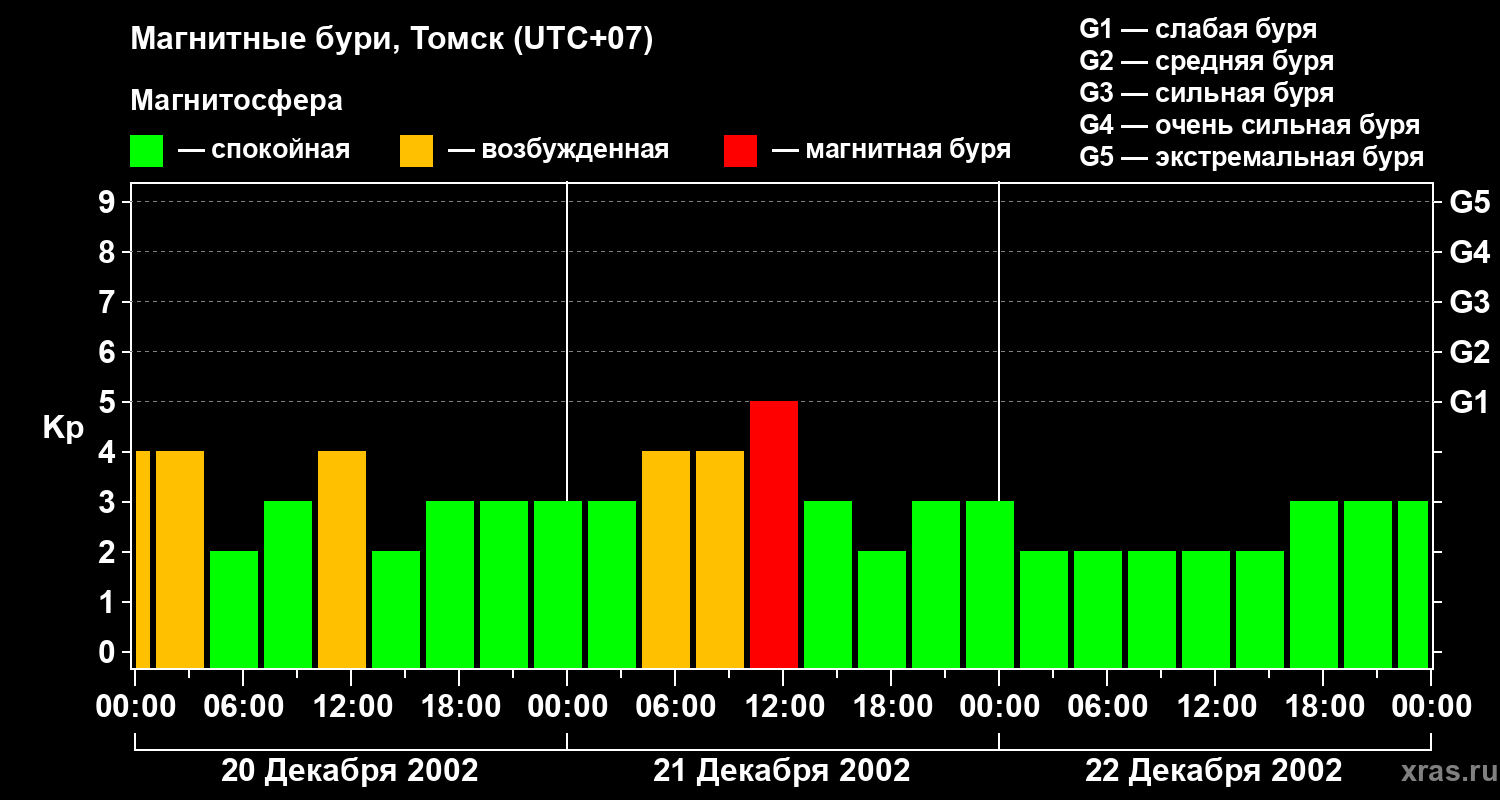 Изменения геомагнитного индекса Kp с 20 по 22 декабря 2002 года для средних широт
