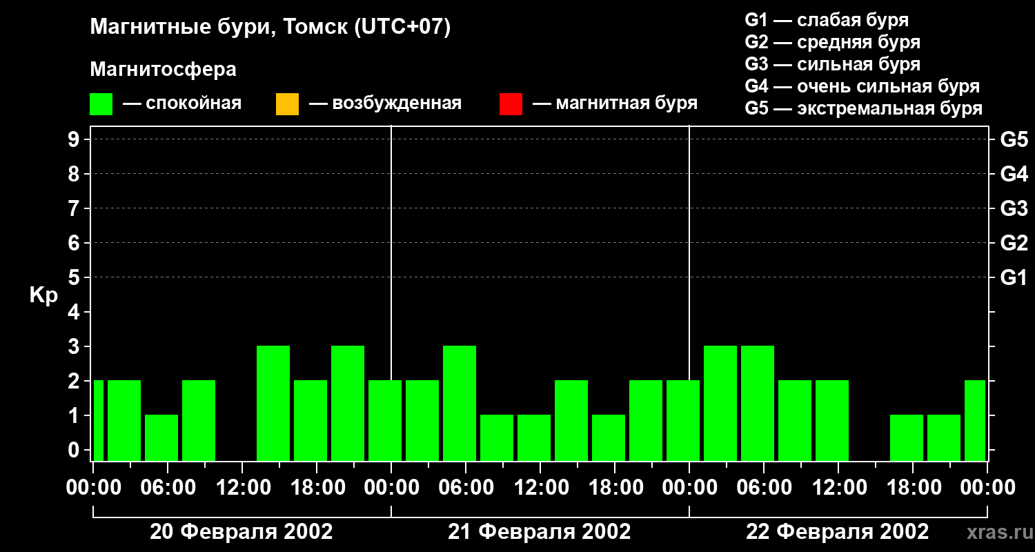 Изменения геомагнитного индекса Kp с 20 по 22 февраля 2002 года для средних широт