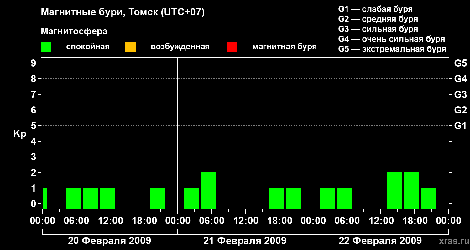 Изменения геомагнитного индекса Kp с 20 по 22 февраля 2009 года для средних широт