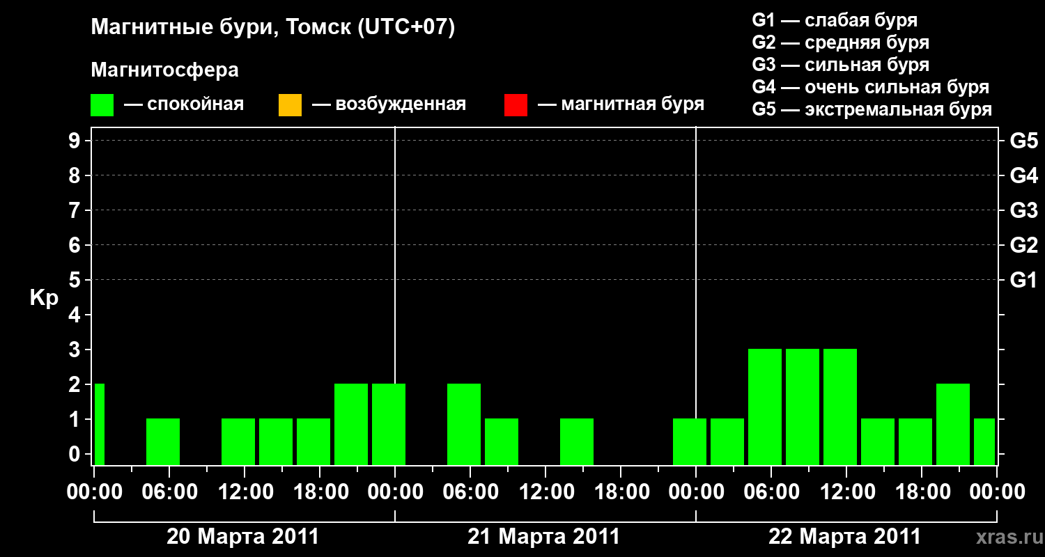 Изменения геомагнитного индекса Kp с 20 по 22 марта 2011 года для средних широт