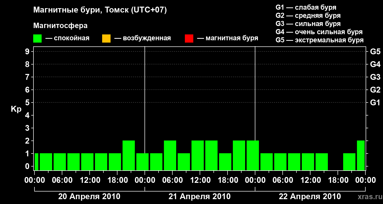 Изменения геомагнитного индекса Kp с 20 по 22 апреля 2010 года для средних широт