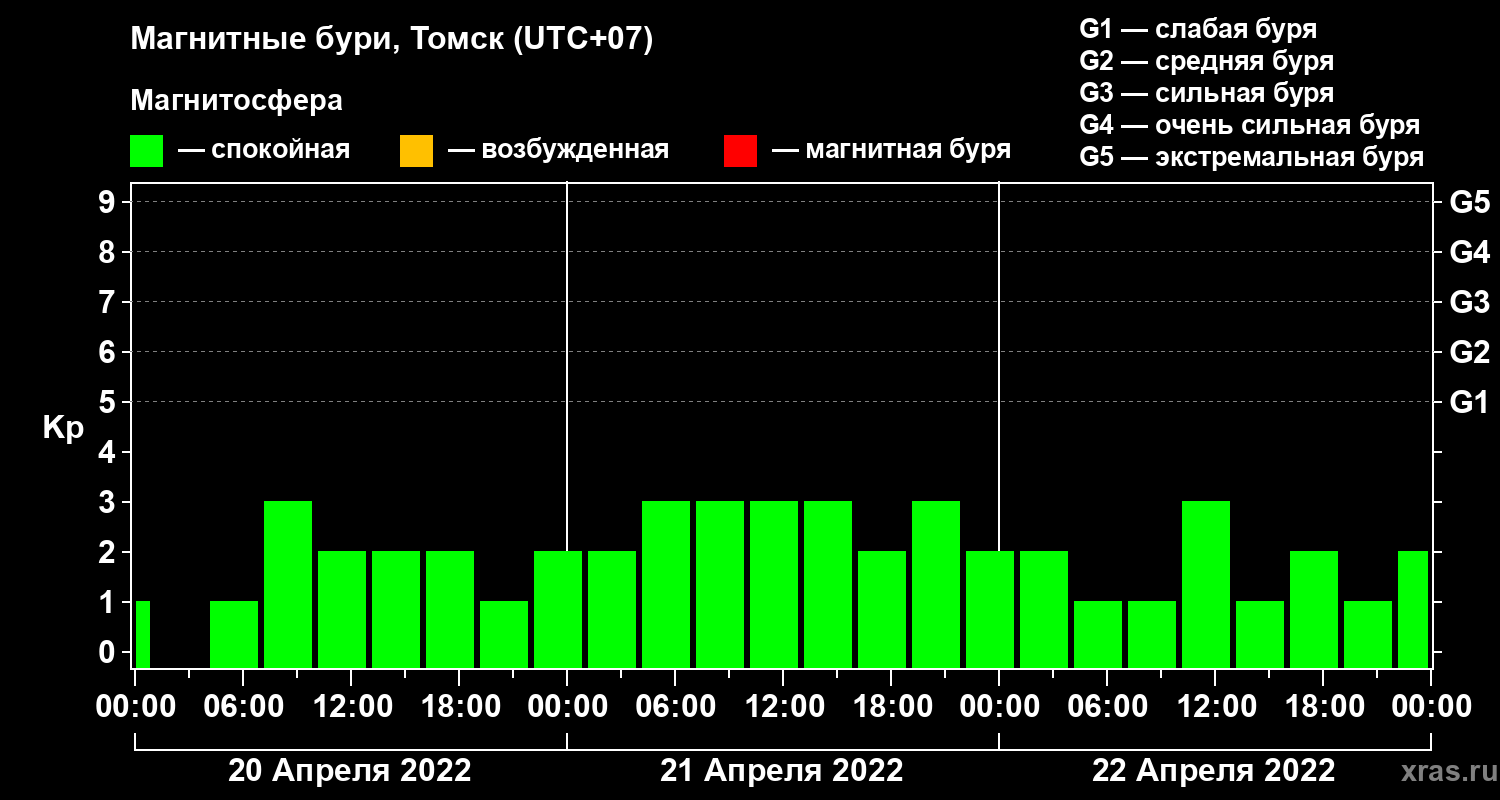 Изменения геомагнитного индекса Kp с 20 по 22 апреля 2022 года для средних широт