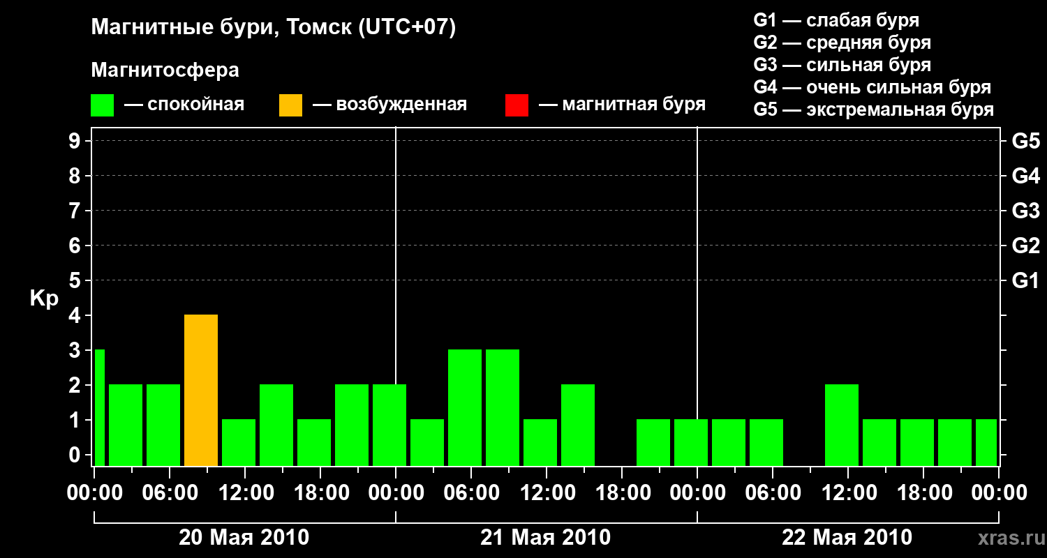 Изменения геомагнитного индекса Kp с 20 по 22 мая 2010 года для средних широт