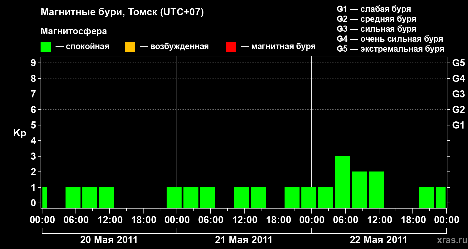 Изменения геомагнитного индекса Kp с 20 по 22 мая 2011 года для средних широт