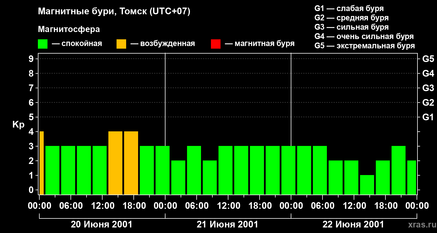 Изменения геомагнитного индекса Kp с 20 по 22 июня 2001 года для средних широт