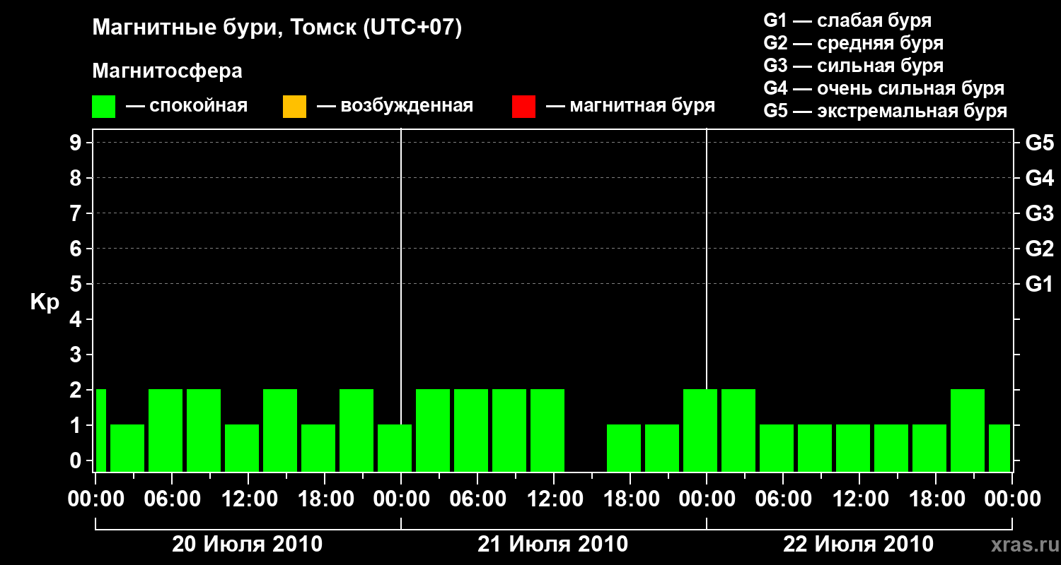 Изменения геомагнитного индекса Kp с 20 по 22 июля 2010 года для средних широт