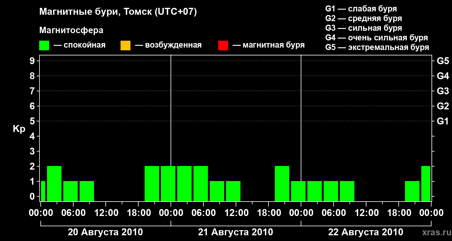 Изменения геомагнитного индекса Kp с 20 по 22 августа 2010 года для средних широт