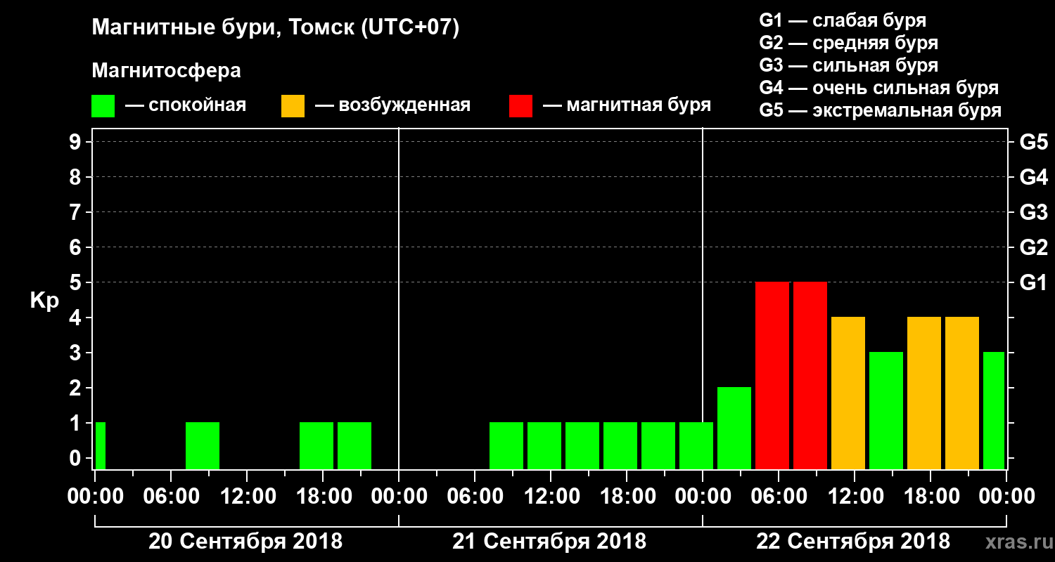 Изменения геомагнитного индекса Kp с 20 по 22 сентября 2018 года для средних широт