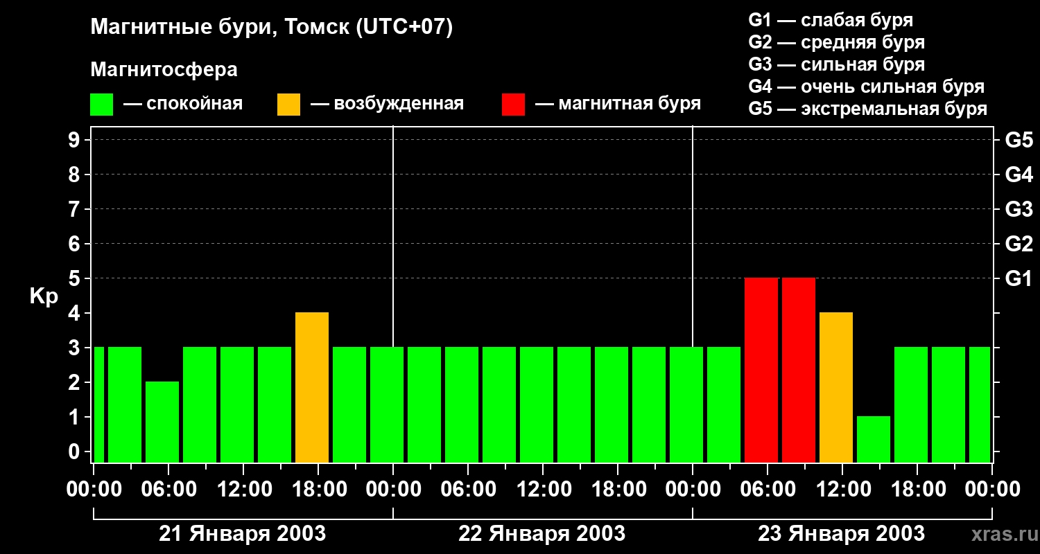 Изменения геомагнитного индекса Kp с 21 по 23 января 2003 года для средних широт