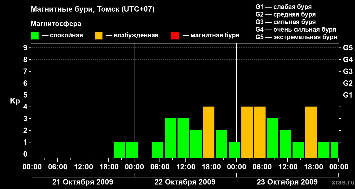 Изменения геомагнитного индекса Kp с 21 по 23 октября 2009 года для средних широт