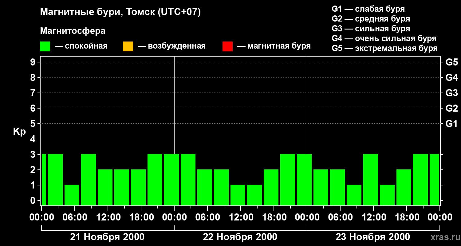 Изменения геомагнитного индекса Kp с 21 по 23 ноября 2000 года для средних широт