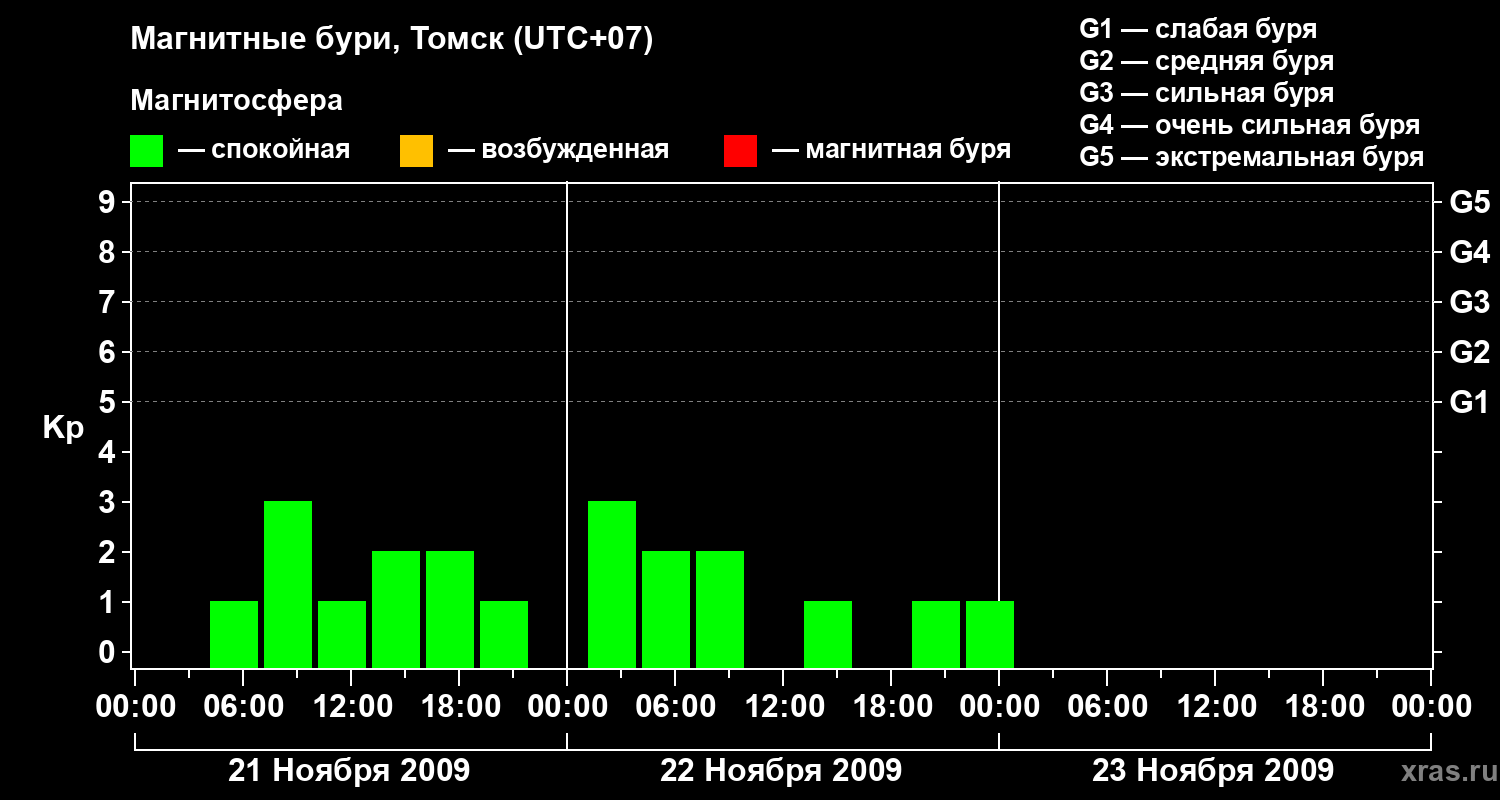 Изменения геомагнитного индекса Kp с 21 по 23 ноября 2009 года для средних широт