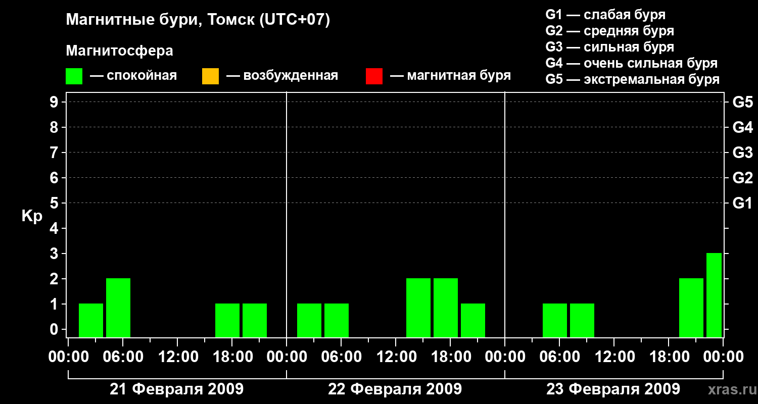 Изменения геомагнитного индекса Kp с 21 по 23 февраля 2009 года для средних широт