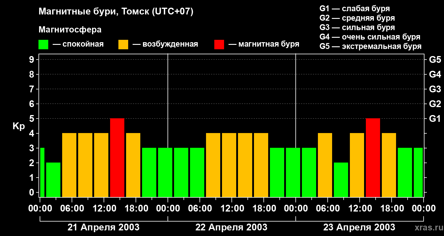 Изменения геомагнитного индекса Kp с 21 по 23 апреля 2003 года для средних широт