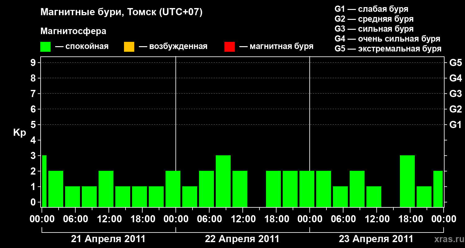 Изменения геомагнитного индекса Kp с 21 по 23 апреля 2011 года для средних широт