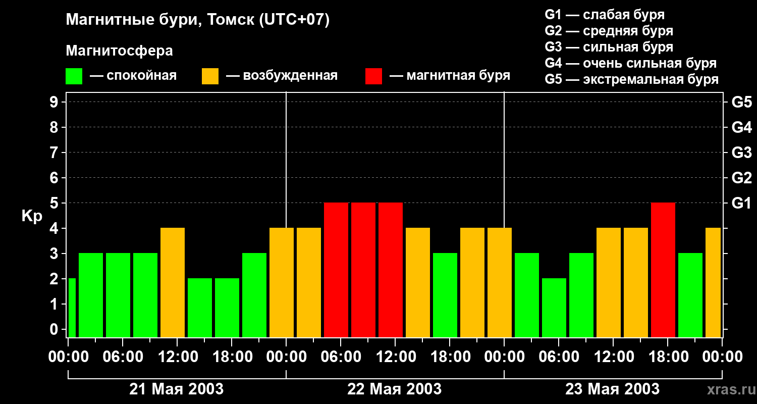 Изменения геомагнитного индекса Kp с 21 по 23 мая 2003 года для средних широт