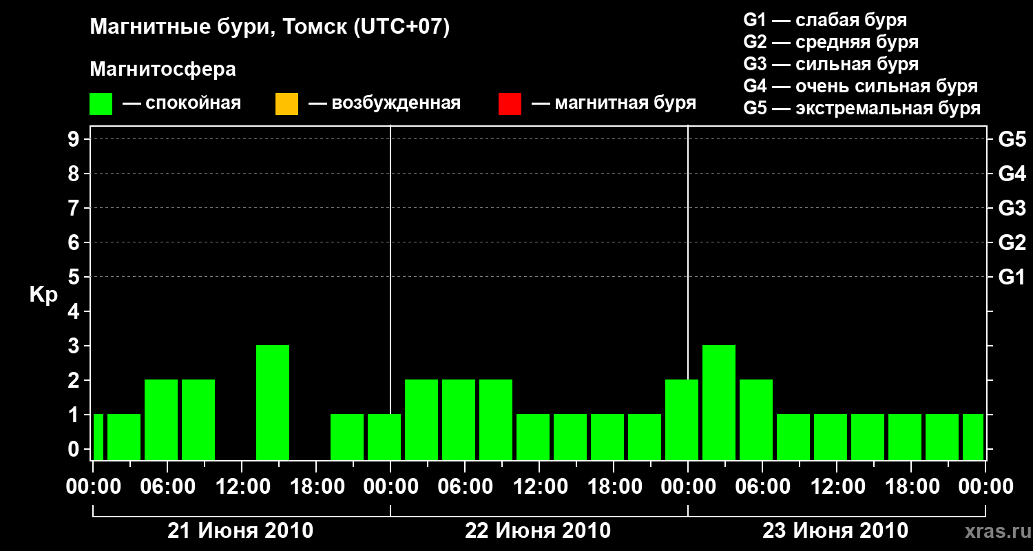 Изменения геомагнитного индекса Kp с 21 по 23 июня 2010 года для средних широт