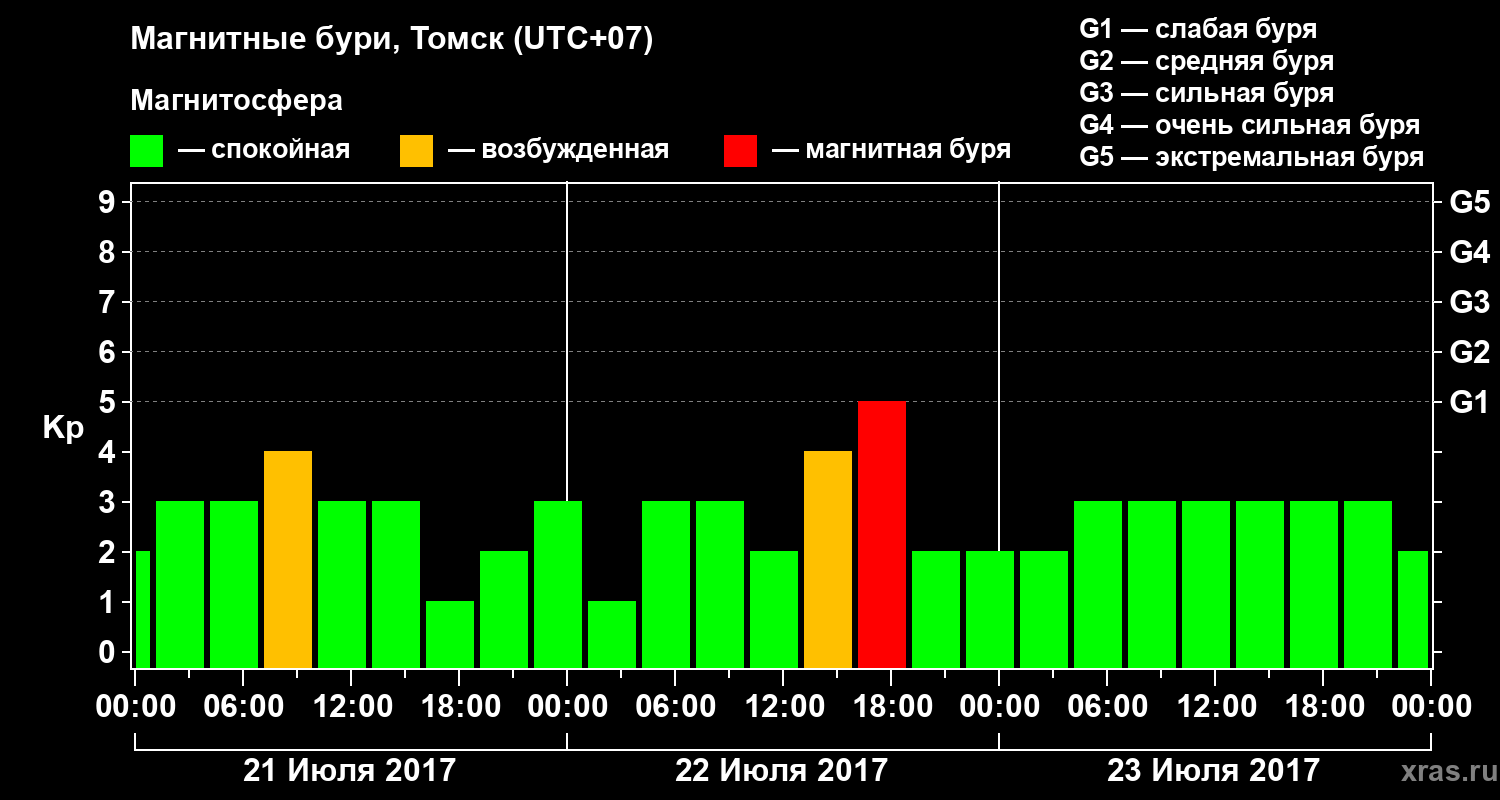 Изменения геомагнитного индекса Kp с 21 по 23 июля 2017 года для средних широт