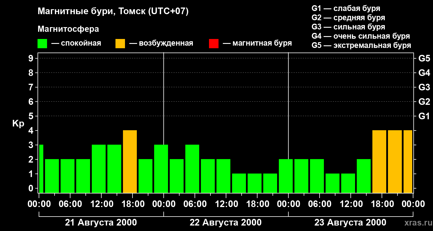 Изменения геомагнитного индекса Kp с 21 по 23 августа 2000 года для средних широт