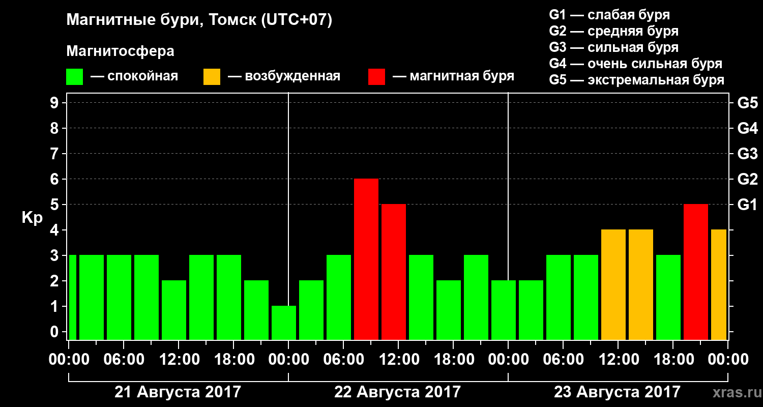 Изменения геомагнитного индекса Kp с 21 по 23 августа 2017 года для средних широт
