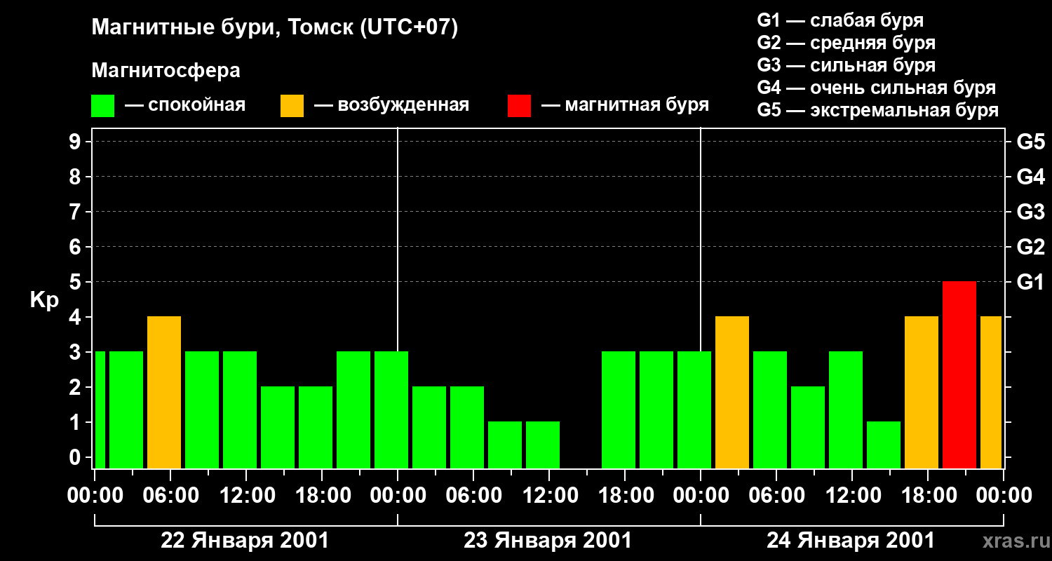 Изменения геомагнитного индекса Kp с 22 по 24 января 2001 года для средних широт