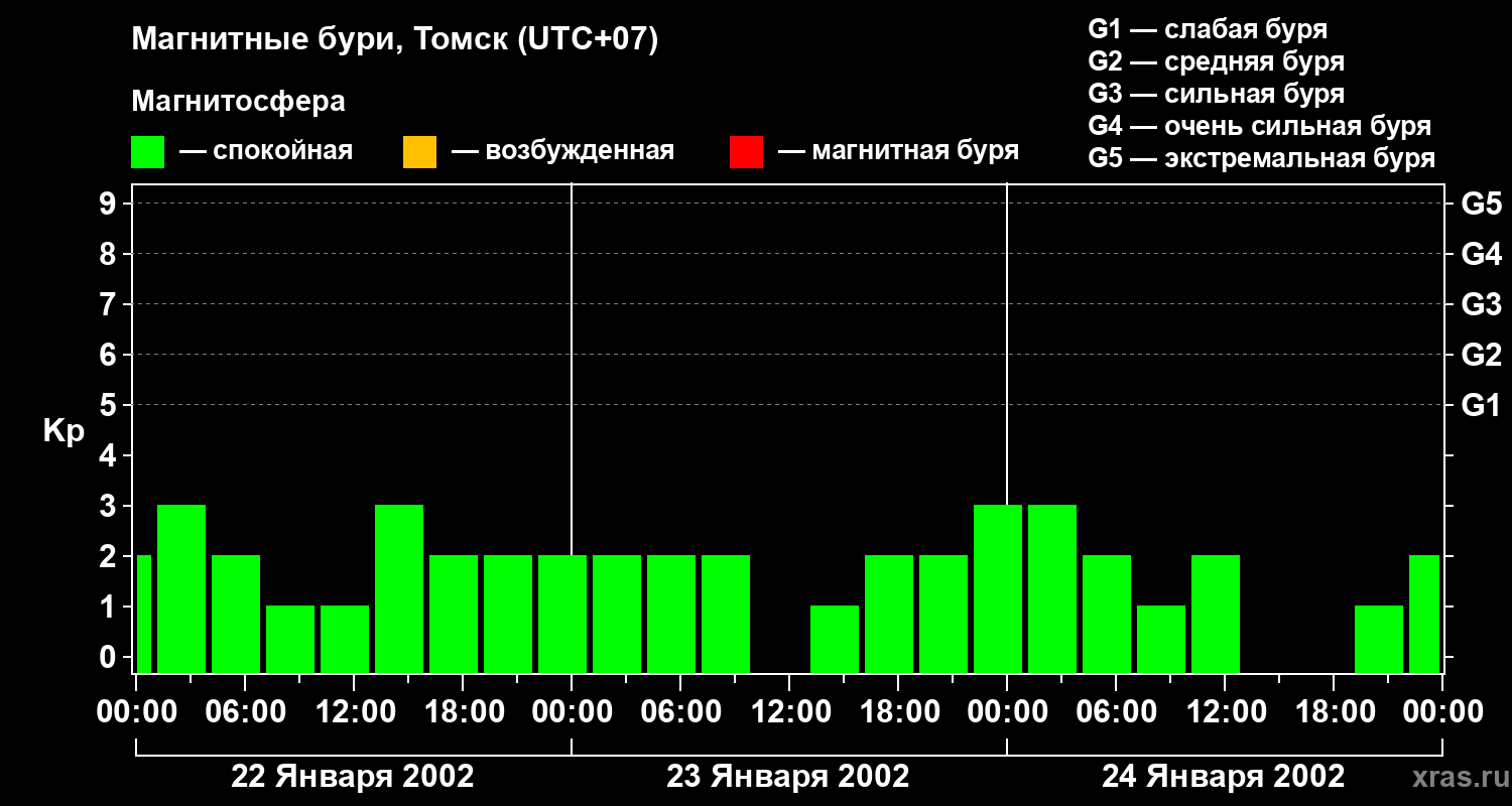 Изменения геомагнитного индекса Kp с 22 по 24 января 2002 года для средних широт