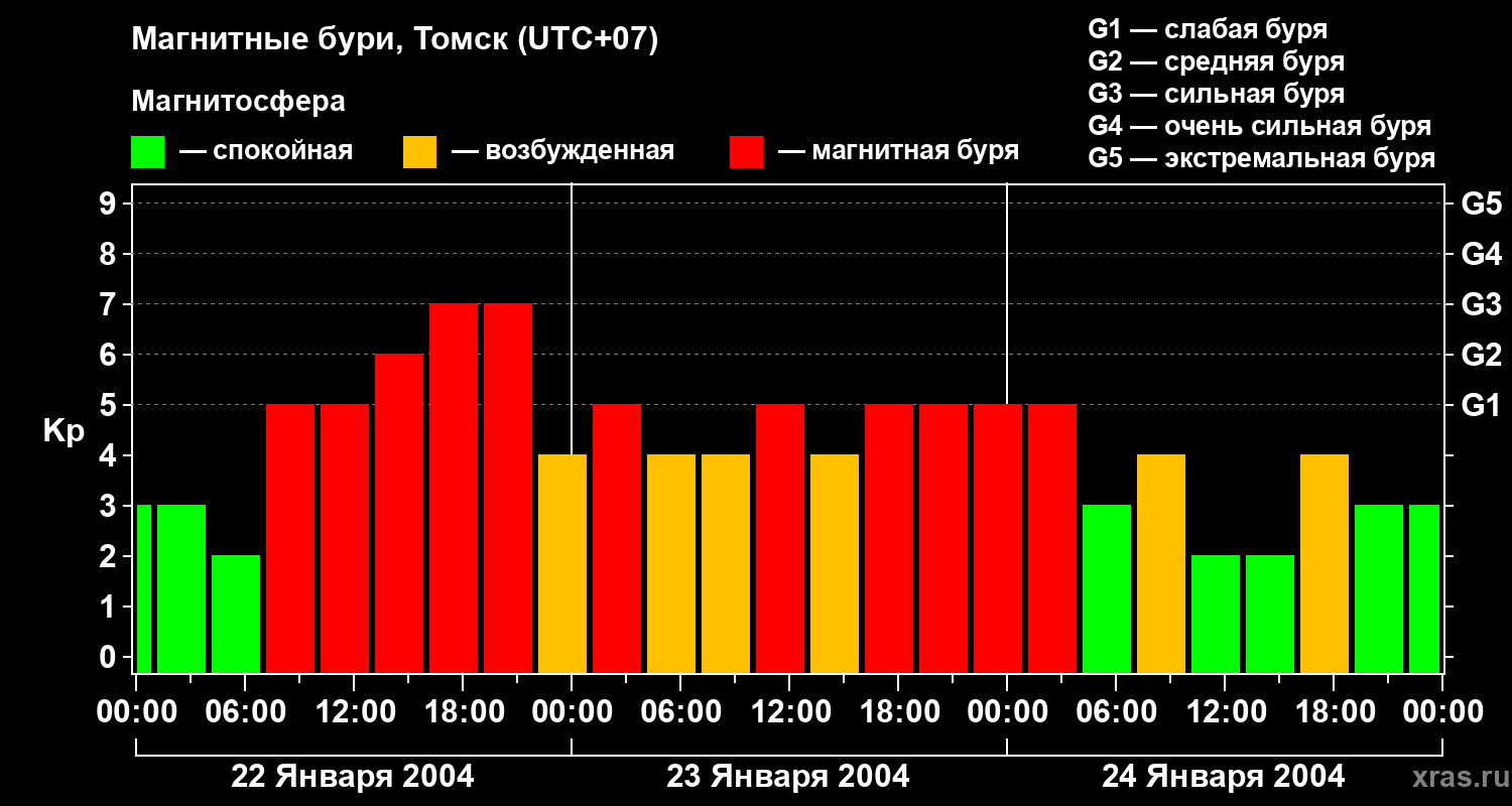 Изменения геомагнитного индекса Kp с 22 по 24 января 2004 года для средних широт