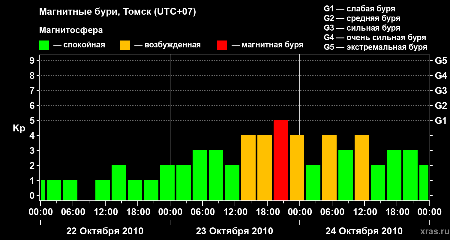 Изменения геомагнитного индекса Kp с 22 по 24 октября 2010 года для средних широт