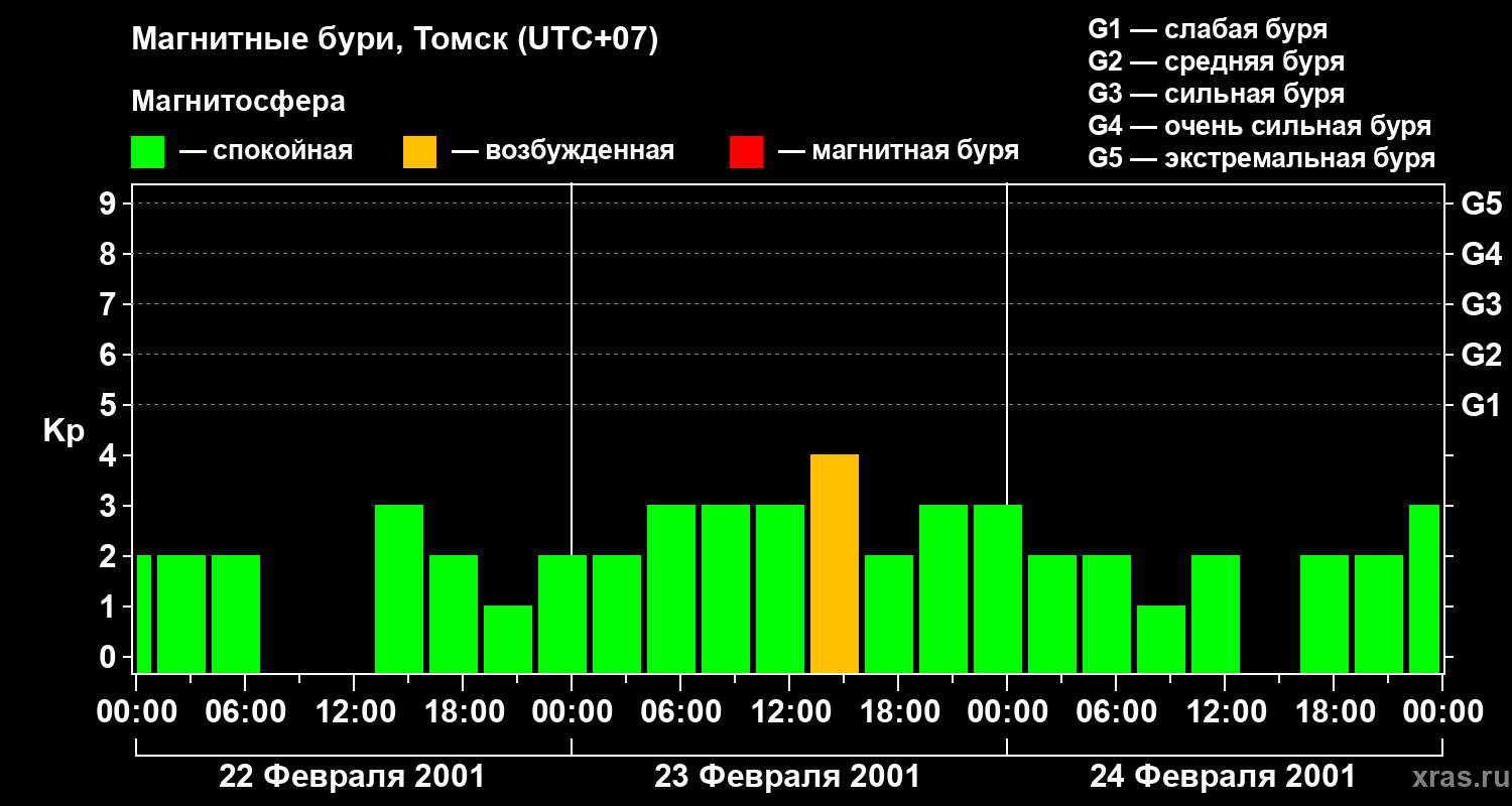 Изменения геомагнитного индекса Kp с 22 по 24 февраля 2001 года для средних широт