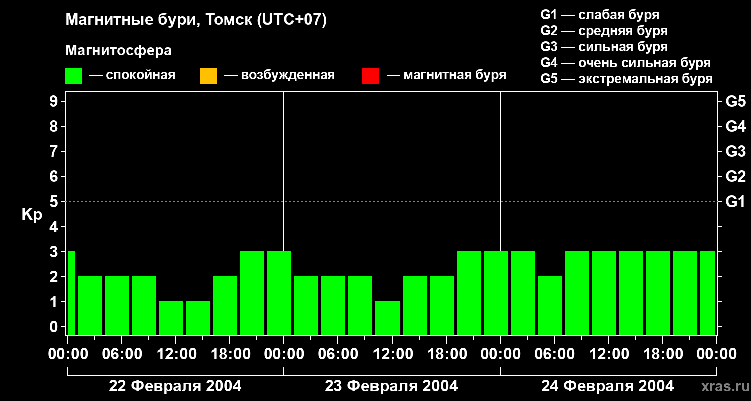 Изменения геомагнитного индекса Kp с 22 по 24 февраля 2004 года для средних широт