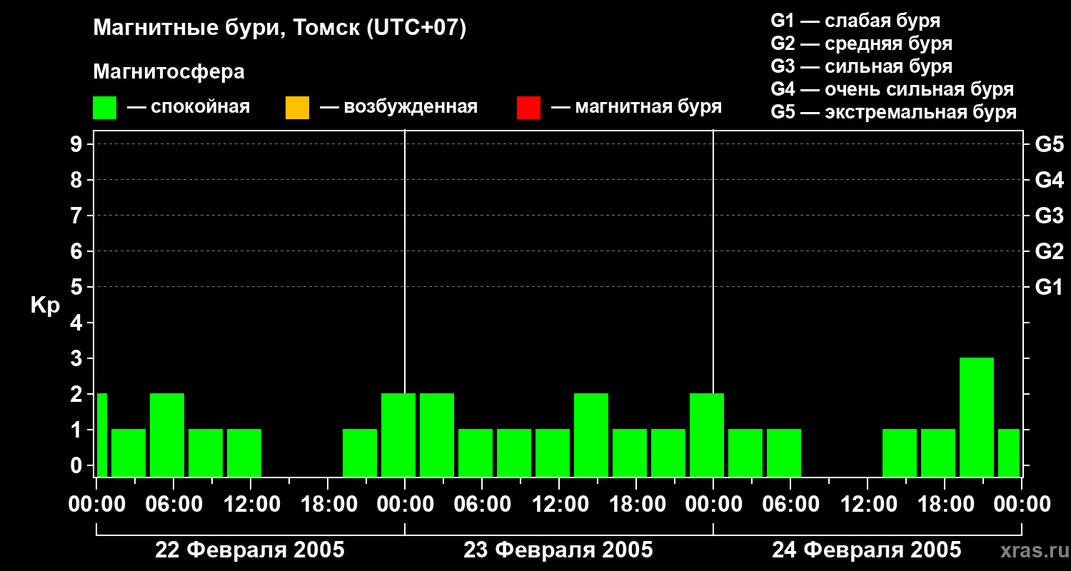 Изменения геомагнитного индекса Kp с 22 по 24 февраля 2005 года для средних широт