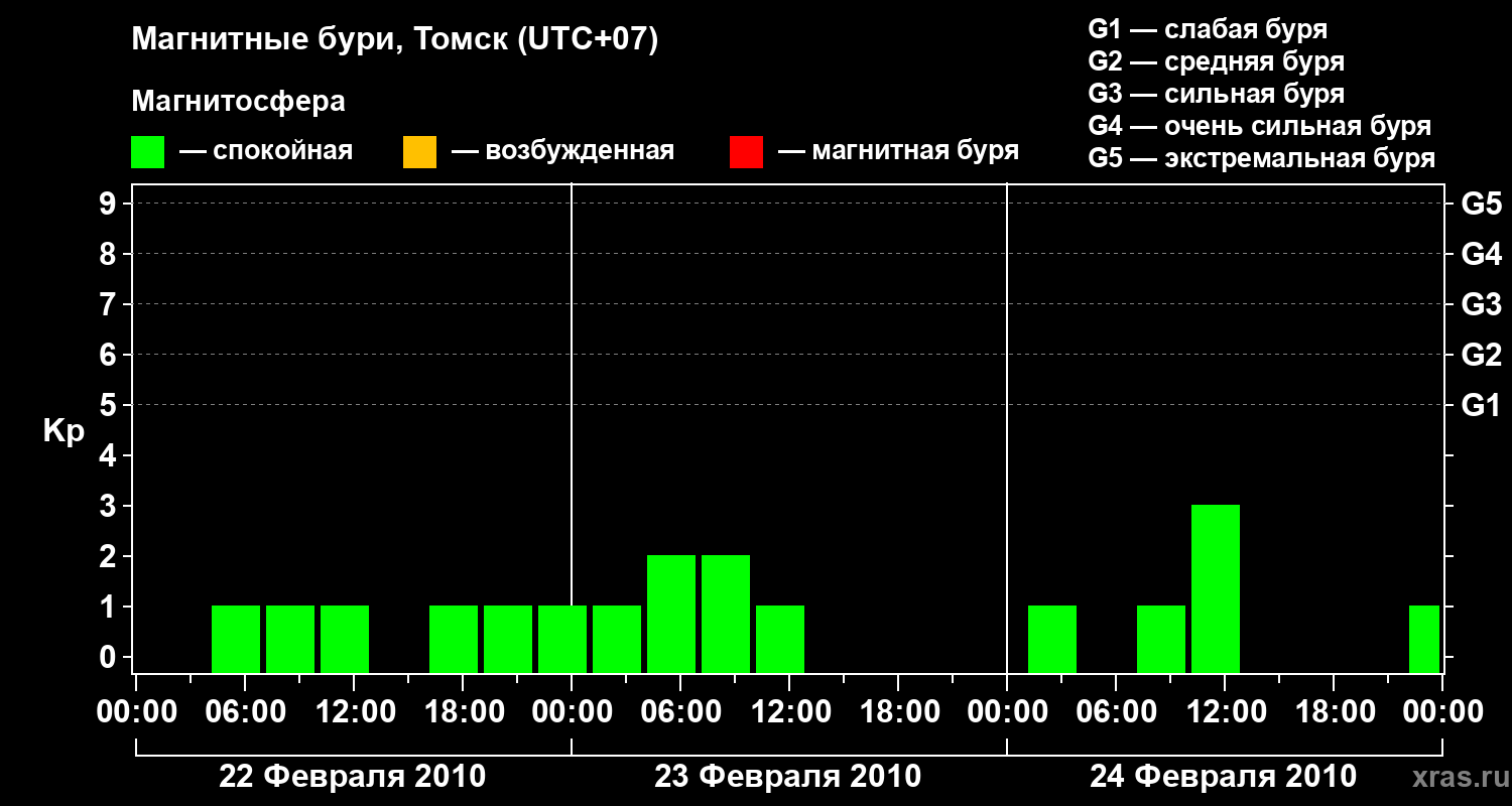 Изменения геомагнитного индекса Kp с 22 по 24 февраля 2010 года для средних широт