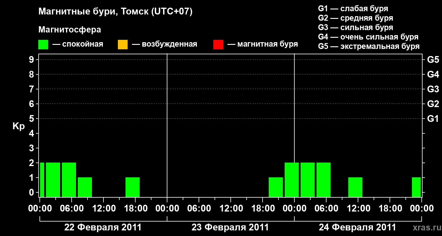 Изменения геомагнитного индекса Kp с 22 по 24 февраля 2011 года для средних широт