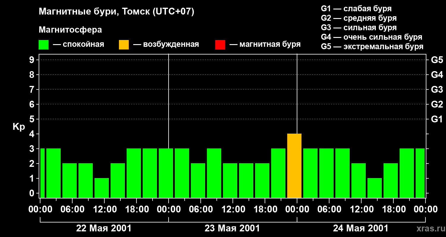 Изменения геомагнитного индекса Kp с 22 по 24 мая 2001 года для средних широт