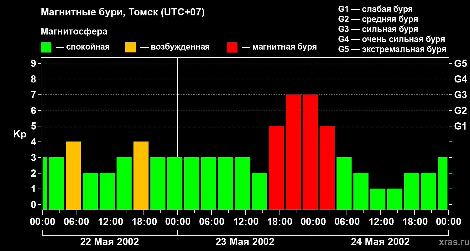 Изменения геомагнитного индекса Kp с 22 по 24 мая 2002 года для средних широт