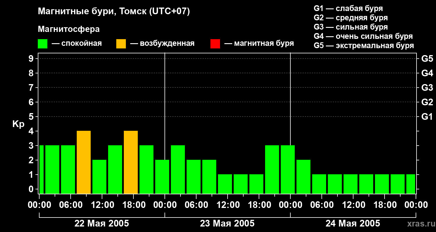 Изменения геомагнитного индекса Kp с 22 по 24 мая 2005 года для средних широт