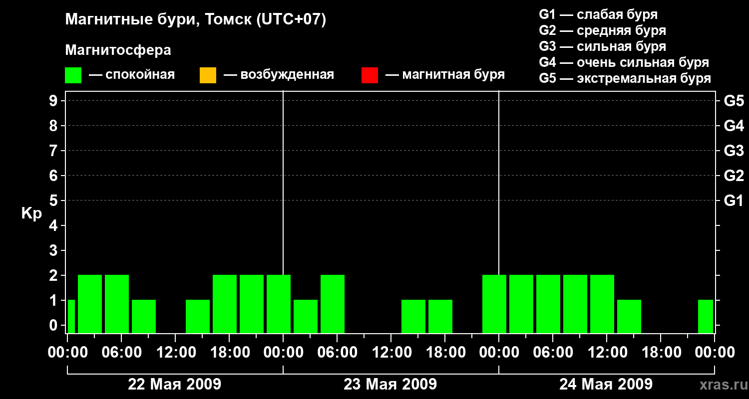 Изменения геомагнитного индекса Kp с 22 по 24 мая 2009 года для средних широт