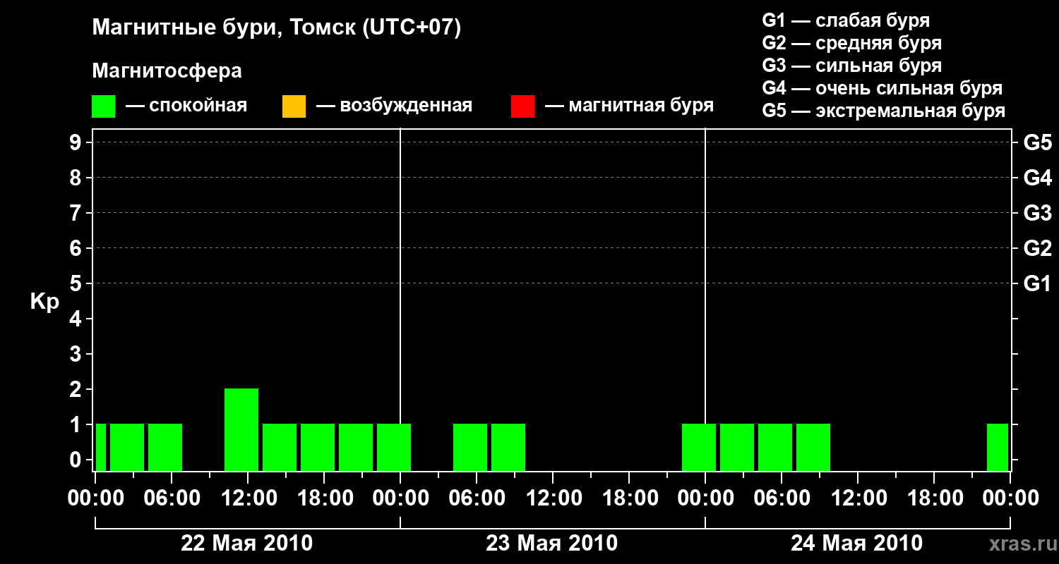 Изменения геомагнитного индекса Kp с 22 по 24 мая 2010 года для средних широт