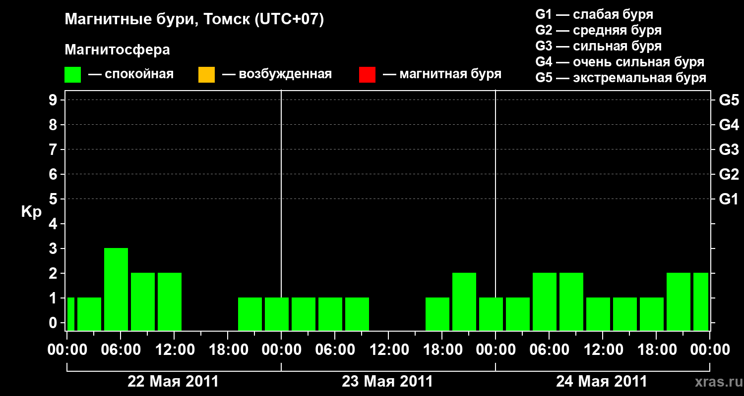 Изменения геомагнитного индекса Kp с 22 по 24 мая 2011 года для средних широт