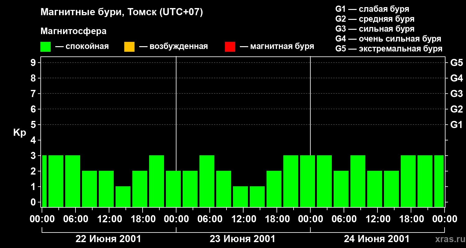 Изменения геомагнитного индекса Kp с 22 по 24 июня 2001 года для средних широт