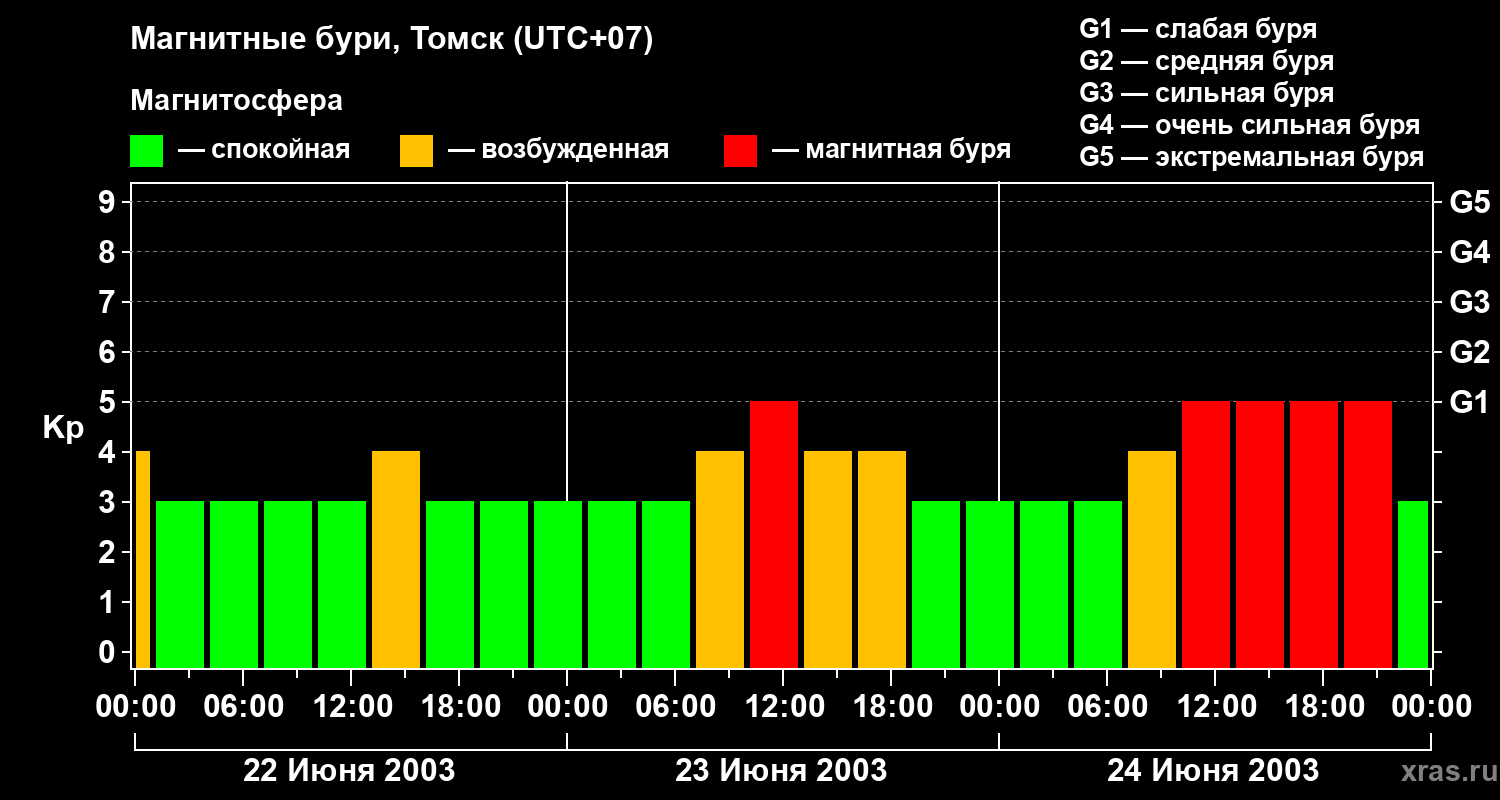 Изменения геомагнитного индекса Kp с 22 по 24 июня 2003 года для средних широт